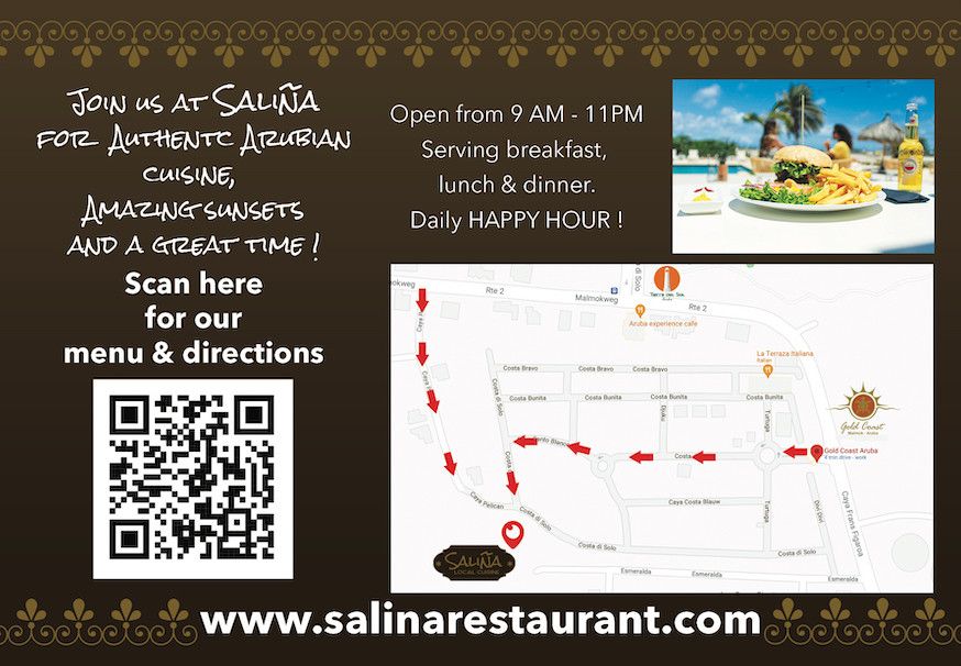 Enjoy local cuisine in the beautiful surroundings of our restaurant. Join us at SALIÑA for authentic Arubian cuisine, amazing sunsets and great time. Open from 9 AM - 11 PM. Serving breakfast, lunch & dinner.